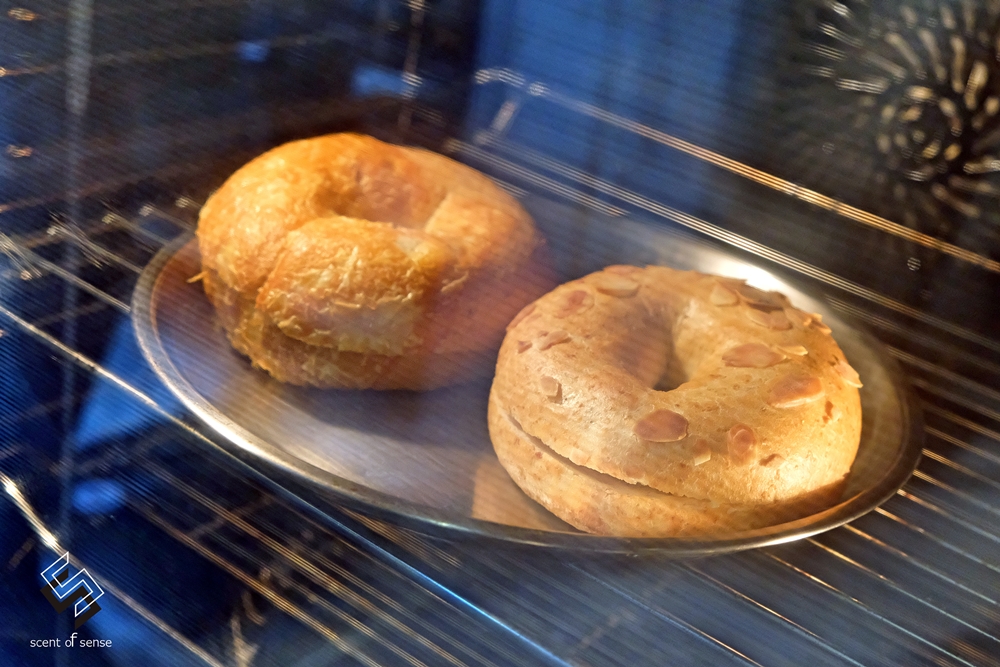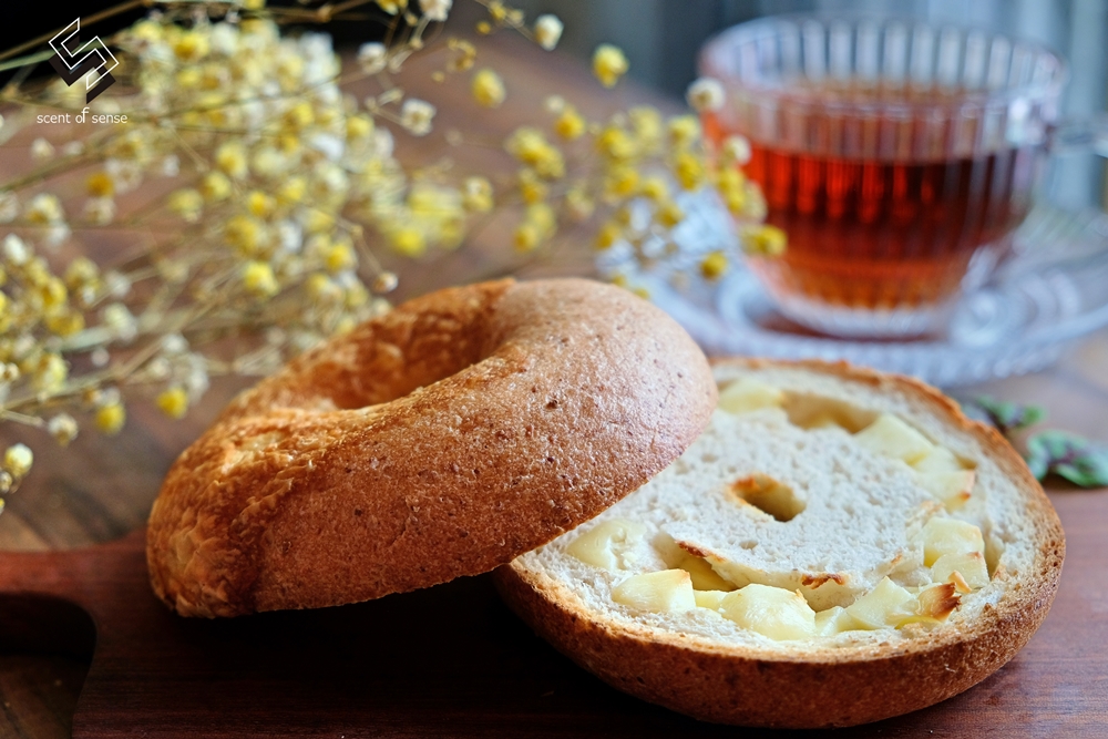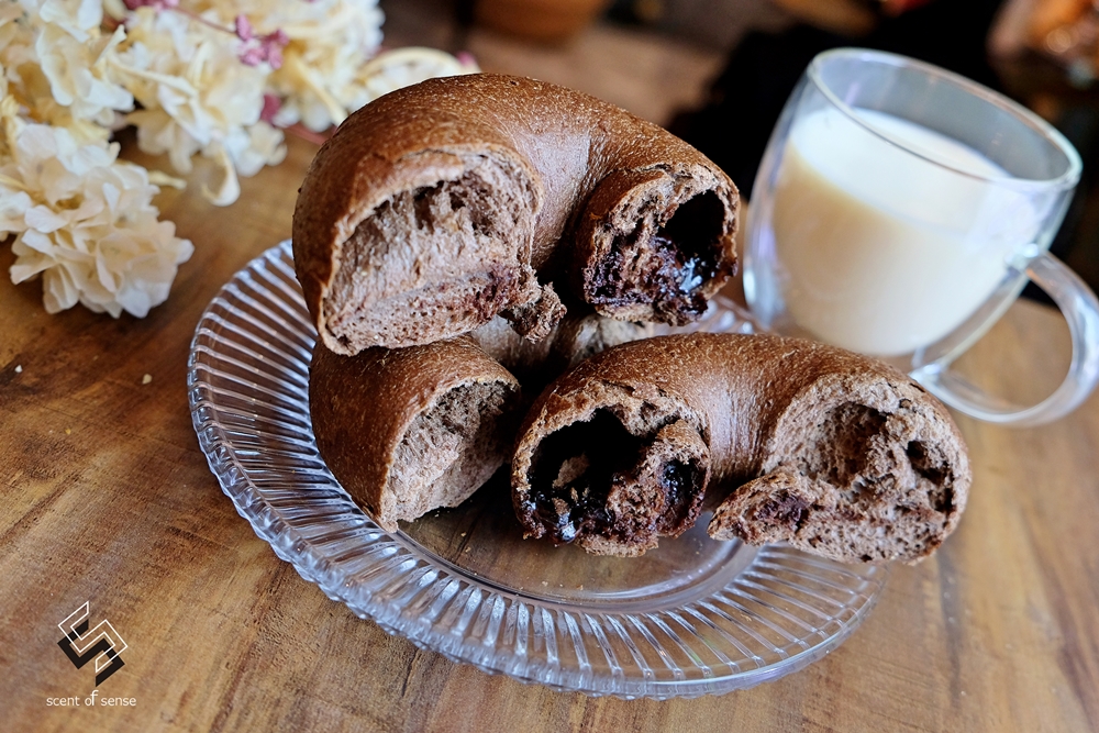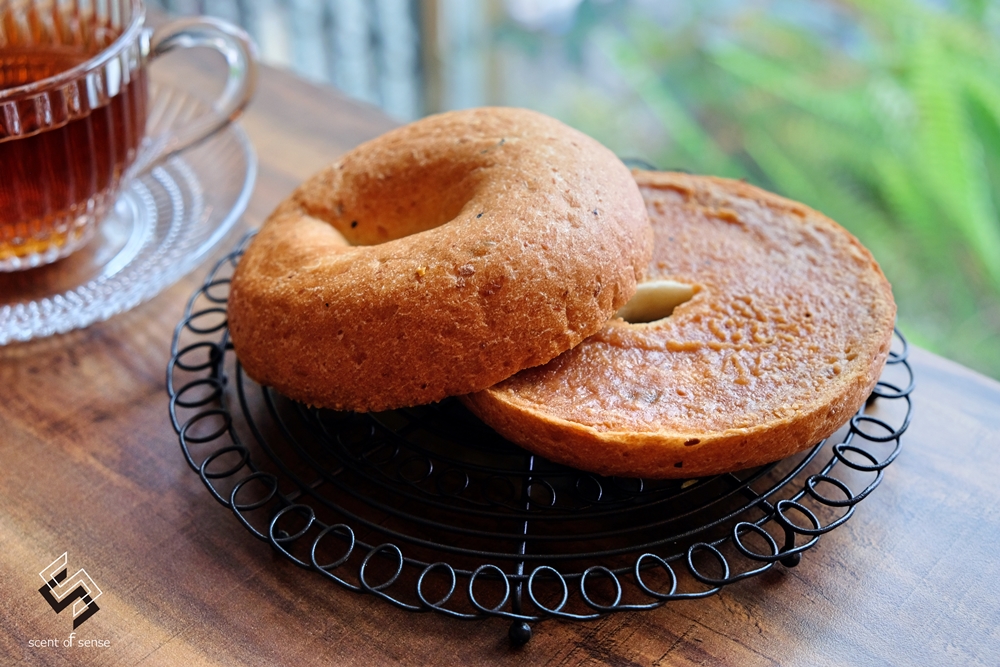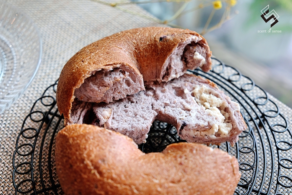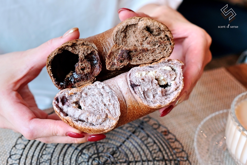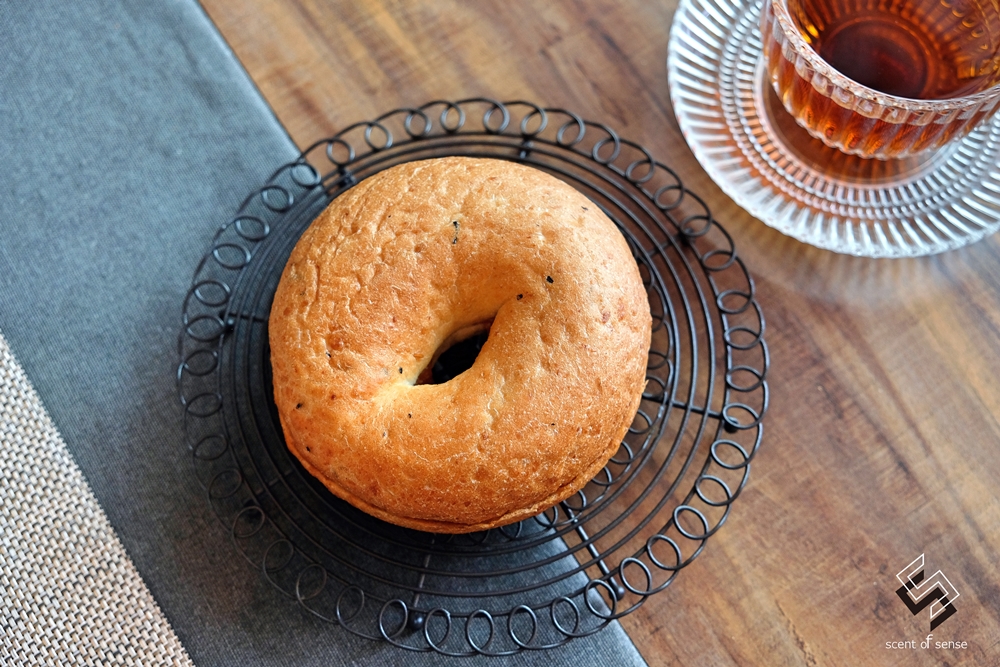 混合72%比利時巧克力與100%可可粉製成,賦予貝果本身多重風味層次,如同在味蕾上噴灑一縷可可香水,以前中後調展開,剛入口是可可微苦與甘甜交織,隨著咀嚼,釋放出更深沉巧克力氣息,直到吞嚥入喉,尾韻留下微微果酸與隱約堅果香,值得細細品味。