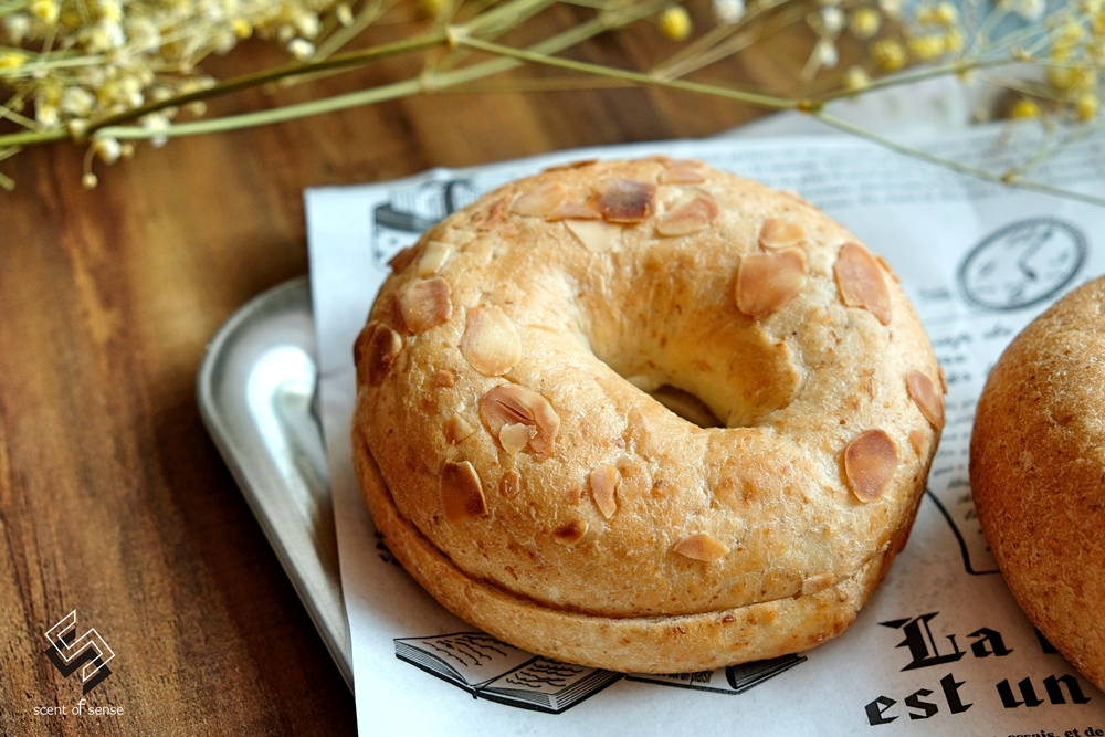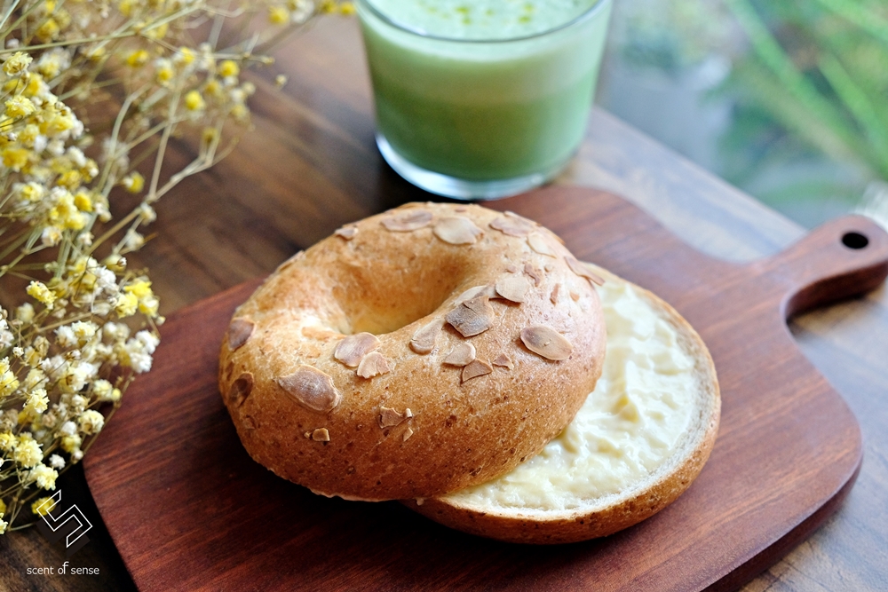 內餡以法國天然果露海鹽焦糖、澳洲進口鮮奶油乳酪製作,還不忘在貝果表面撒上香脆杏仁薄片,於口感和風味上堆疊出豐富層次,可塑性也很強,隨意搭些蔬果都能驚豔味蕾,深得我心。