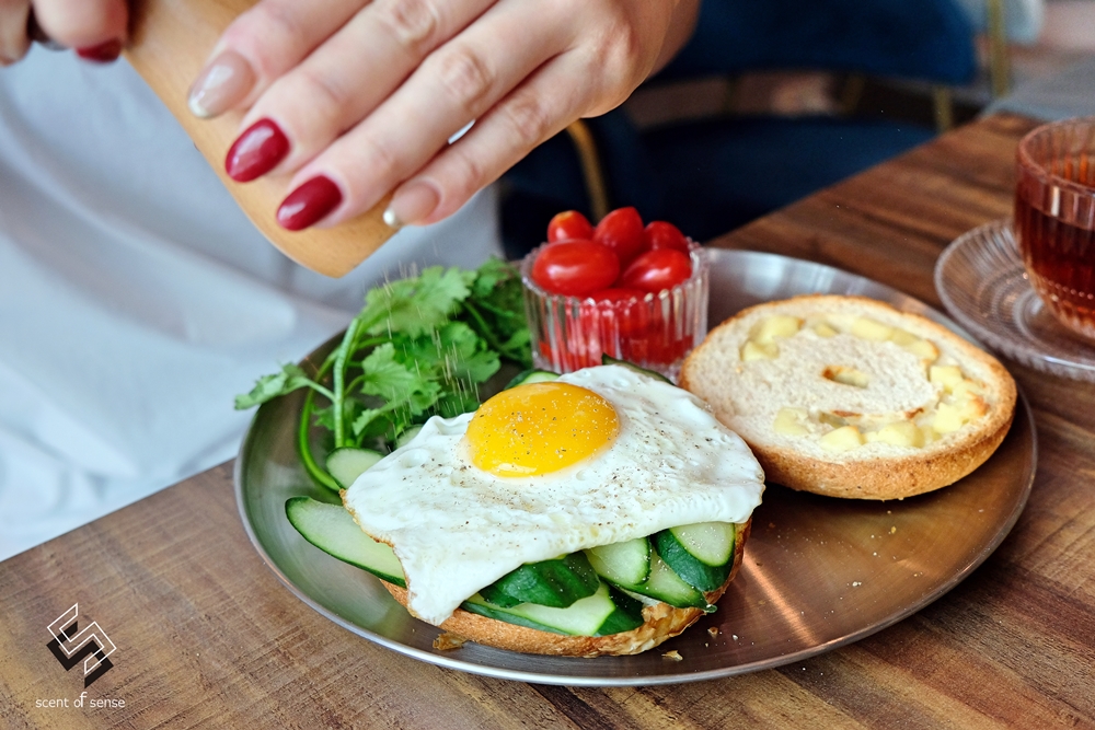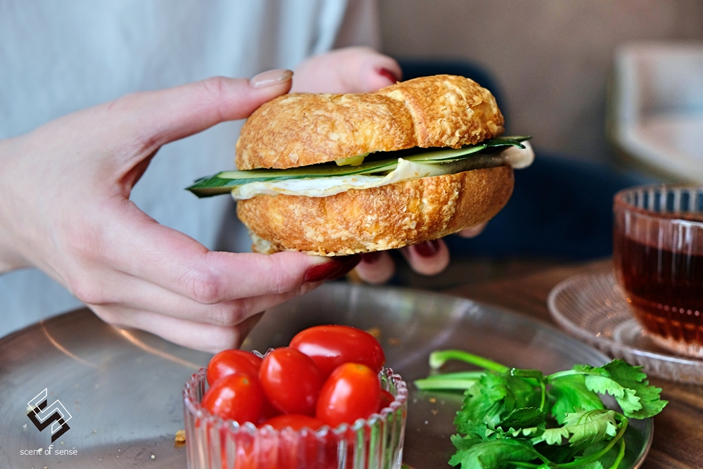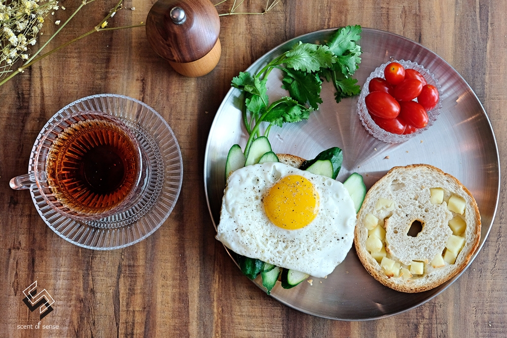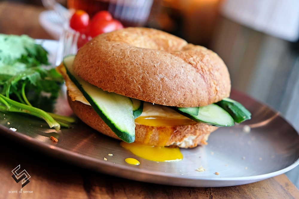 在重乳酪起司貝果上放滿小黃瓜,咬起來清爽脆口,再疊一顆半熟太陽蛋,灑上黑胡椒提味,讓濃厚的起司多了變化,一旁加入幾顆小番茄,配一杯熱紅茶,為自己補充能量,讓心情飛揚。