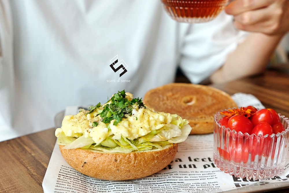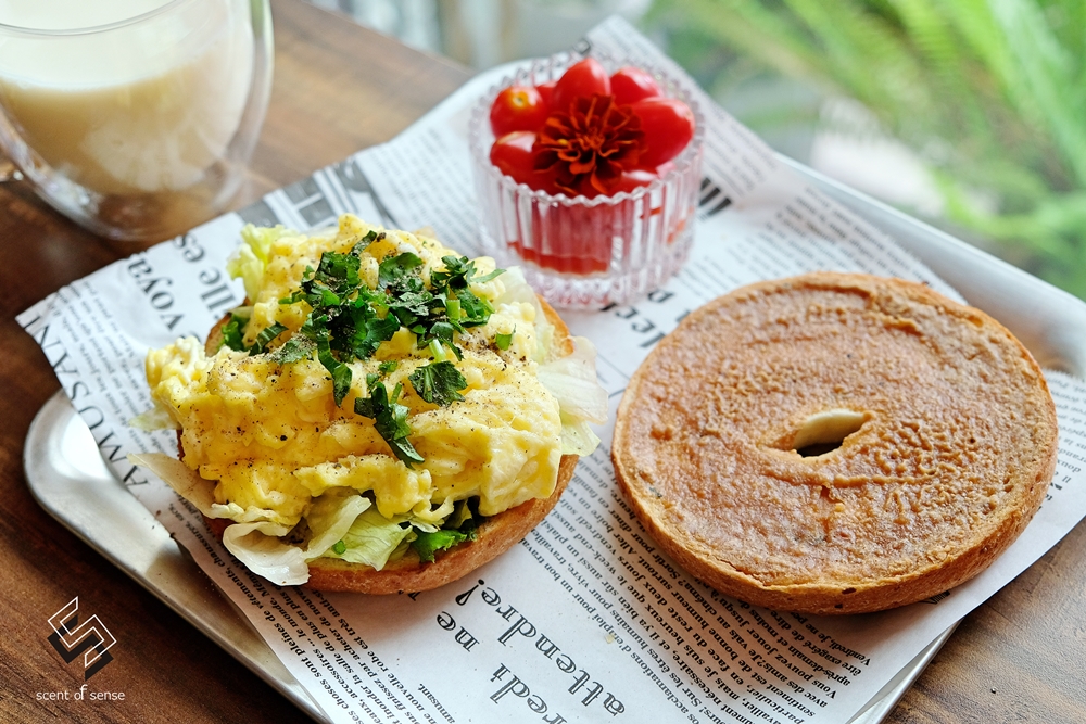 在沒有抹醬的那面墊一層爽脆生菜,放上滑嫩鬆軟的鮮奶炒蛋,最後撒上少許香菜末,與濃郁花生醬堪稱絕配,更別說這顆飄著東方美人茶香的花生貝果,不僅美味度超標,蛋白質總量更接近25g。