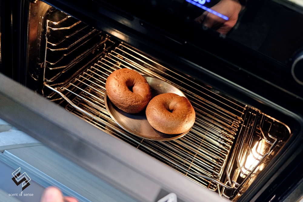 萬一不小心忘記退冰,我會先在電鍋加點水(約20ml),讓貝果回溫、稍微溼軟些,再送進烤箱,無須預熱,直接200°C烤個4-5分鐘,即是我心目中的黃金標準!
